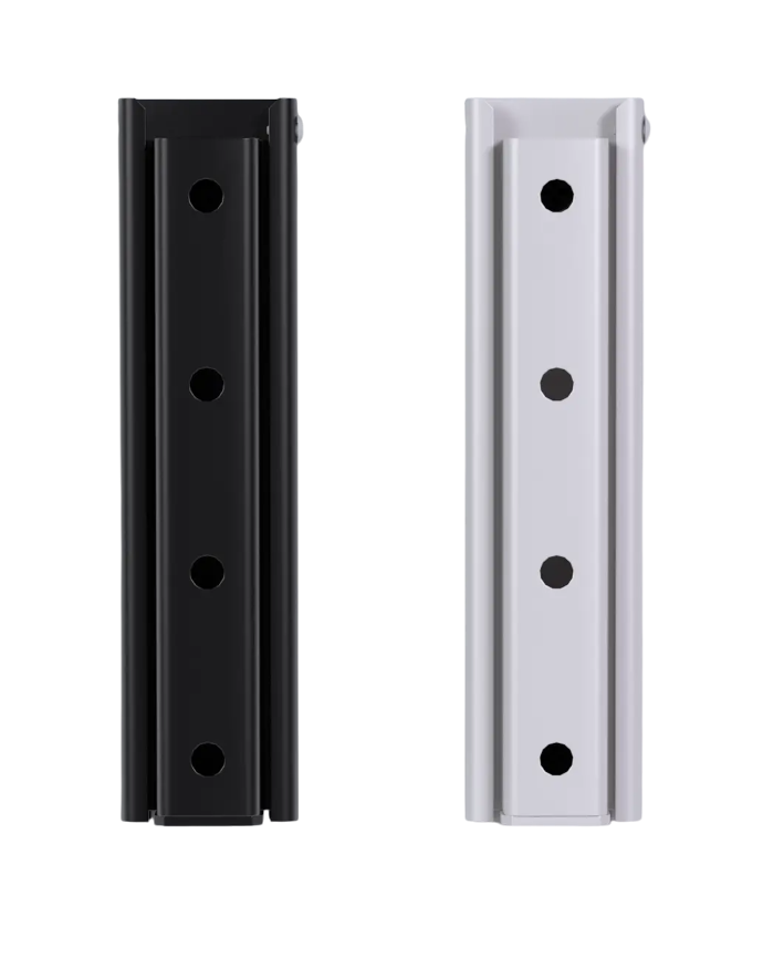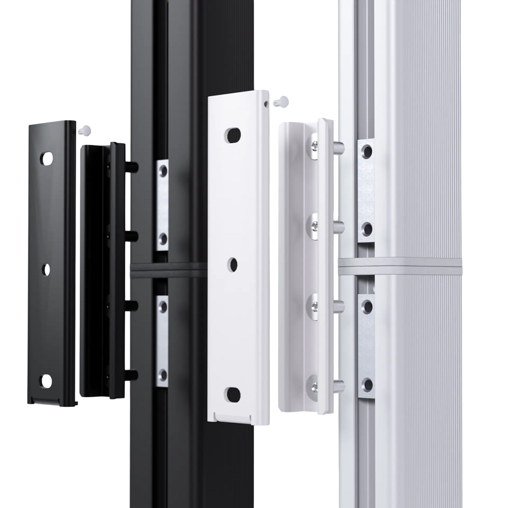 Регулируемая высота. Кронштейн рассчитан на размещение двух колонн друг над другом. Материал изготовления нержавеющая сталь, габаритные размеры 140х35х15 мм, черный цвет.
