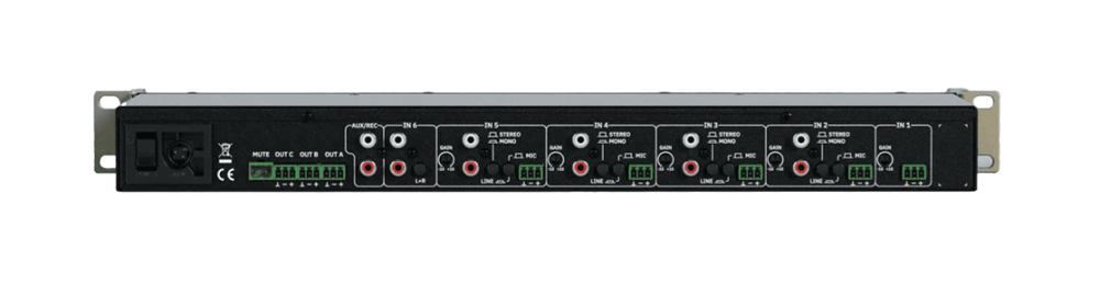 Всего шесть (6) аудиовходов. Четыре (4) комбинированных, микрофонно-линейных, с разъемами 4х Euroblock 3-pin (Mic) / 2RCA (Line); один (1) стереовход Line, разъемы 2RCA; один (1) вход Mic, разъем Jack 3.5 мм. Все микрофонные входы обладают временным подключаемым приоритетом над вещанием (кнопки Talkover). У каждого входа независимые регуляторы громкости; у комбинированных входов дополнительно предусмотрены переключатели уровня сигнала и регуляторы чувствительности. Для микрофонов у всех входов есть фантомное питание (+18В). Для каждого входного канала можно выбрать основной выход.