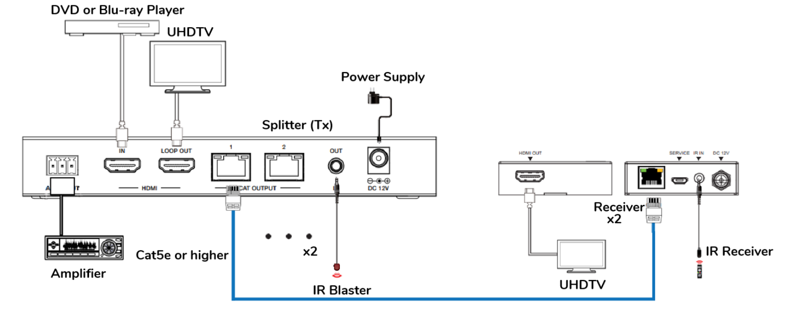 Скорость обмена данными между передатчиком и приемниками составляет 18 Гбит в секунду. Дальность зависит от разрешения сигнала: 4К/60Гц до 35 метров (полоса пропускания 600 МГц), 4К/30Гц до 50 метров (полоса пропускания 300 МГц), 1080p/60Гц до 70 метров (полоса пропускания 148,5 МГц). Подключение кабелем Cat 5e или выше.