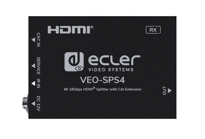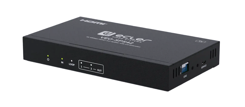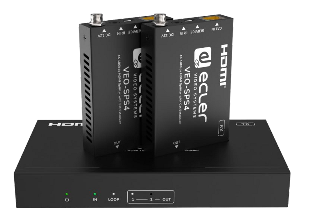 ECLER VEO-SPS42 — это распределитель цифрового сигнала формата HDMI с 1 входа на 2 выхода RJ-45 с целью их дальнейшей передачи по витой паре на один или два приемника из комплекта. К HDMI-выходам приемников подключаются дисплеи.