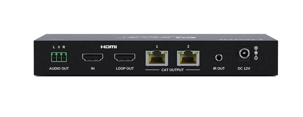 Распределитель-передатчик VEO-SPS42 оснащен следующими разъемами и возможностями: вход HDMI-А 2.0, на него подается сигнал требующий разветвления; выход HDMI-А LOOP для проходного подключения дисплея на месте размещения сплиттера (макс. расстояние 10 м); два сетевых выхода RJ-45; небалансный аналоговый стерео аудиовыход на усилитель мощности, Euroblock 3-pin; выходной ИК-порт для однонаправленного управления приемником; сервисный вход для удаленного управления прибором через интерфейс RS-232, micro USB; DIP-переключатель для управления EDID-данными.