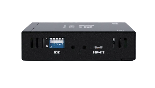 Каждый приемник имеет сетевой вход 1х RJ-45, выход HDMI-A 2.0, входной ИК-порт (назначение см. выше) и сервисный вход для удаленного управления прибором через интерфейс RS-232, разъем micro USB.
