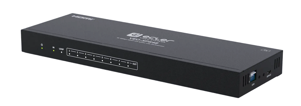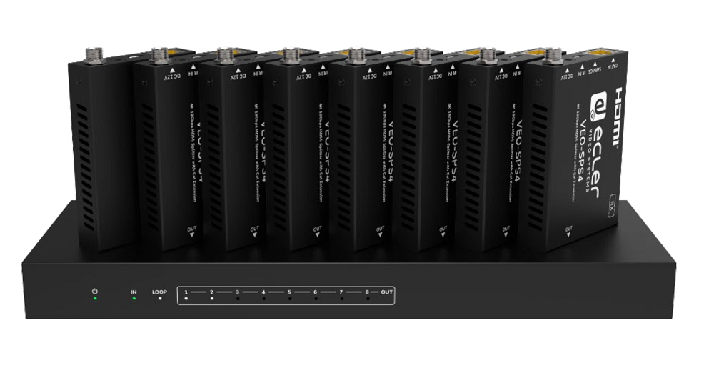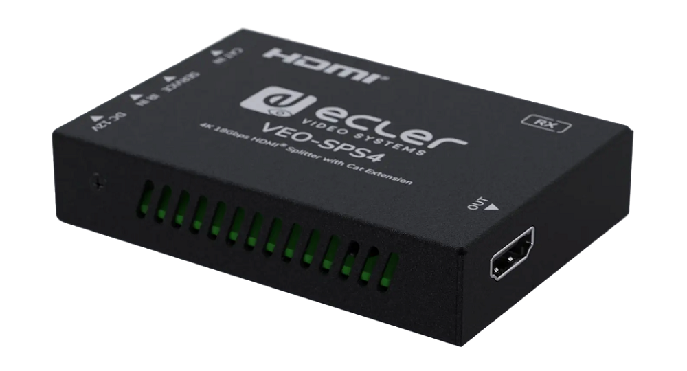 ECLER VEO-SPS48 — это распределитель цифрового сигнала формата HDMI с 1 входа на 4 выхода RJ-45 с целью их дальнейшей передачи по витой паре на один - восемь приемников из комплекта. К HDMI-выходам приемников подключаются дисплеи.