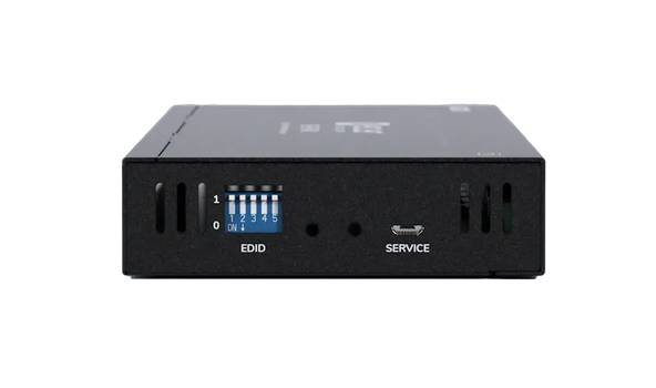 Каждый приемник имеет сетевой вход 1х RJ-45, выход HDMI-A 2.0, входной ИК-порт (назначение см. выше) и сервисный вход для удаленного управления прибором через интерфейс RS-232, разъем micro USB.