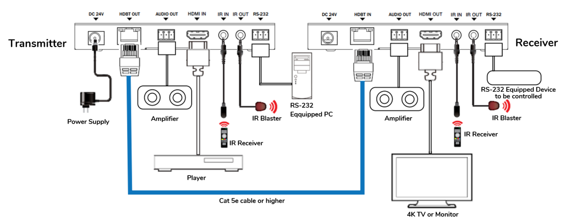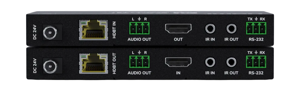Комплект включает в себя два прибора, передатчик и приемник. Ко входу HDMI-A передатчика подключается источник сигнала с очень высоким разрешением, до UHD 4К/60 Гц (4:4:4). Передатчик преобразует его для отправки по сети Ethernet и через выходной разъем RJ-45 по кабелю типа Cat 5e или выше передает сигнал на приемник, расположенный на расстоянии, зависящем от разрешения передаваемого сигнала (для UHD макс. 120 метров). Приемник трансформирует полученный на вход RJ-45 сигнал обратно в стандарт HDMI и транслирует на дисплей через выходной разъем HDMI-A. У каждого блока стерео аудиовыход с разъемом Euroblock 3-pin.