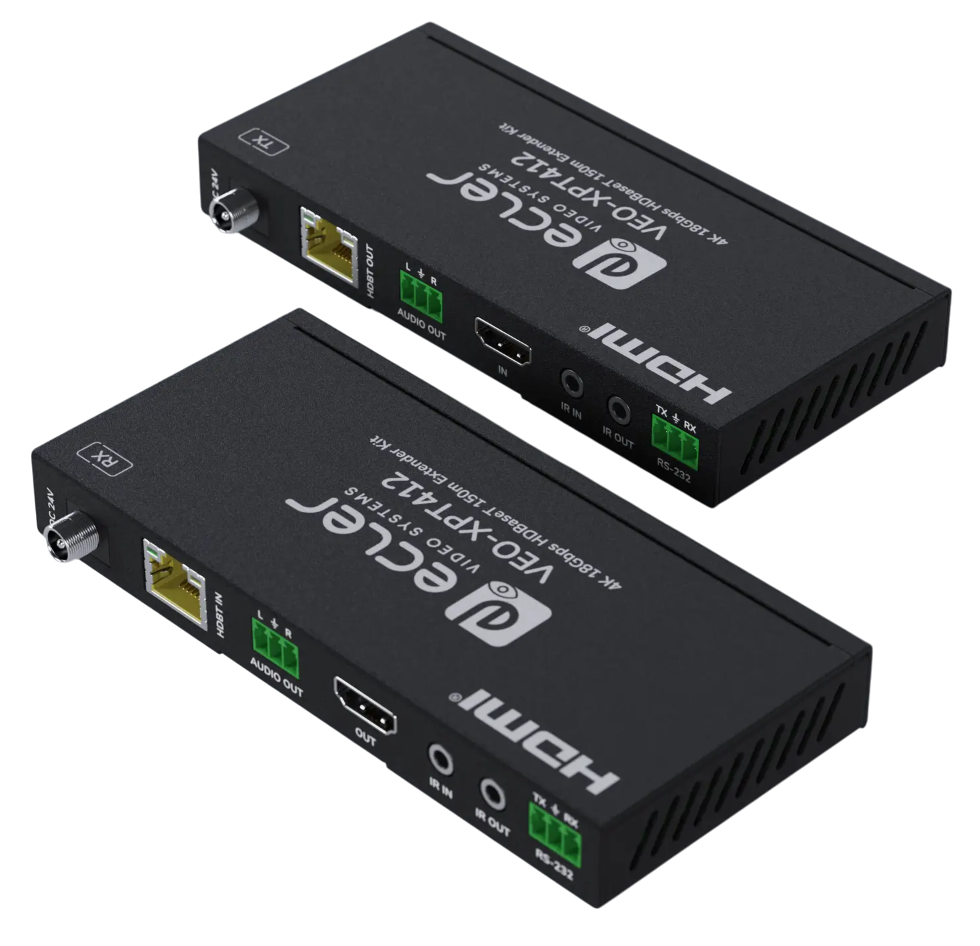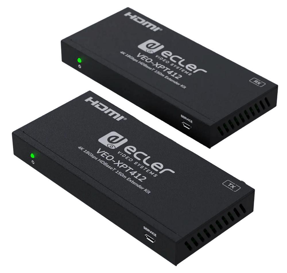 ECLER VEO-XPT412 — это комплект устройств, который используется с целью передачи сигнала стандарта HDMI (2.0, 18 Гбит/сек) по витой паре HDBaseT на расстояние до 150 метров.