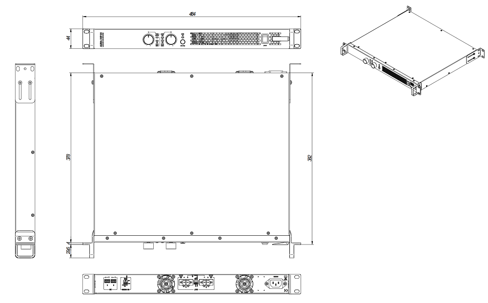 Прибор AURA-2B900 изготовлен в металлическом RACK корпусе высотой 1U, габаритные размеры 484x378x44 мм, вес 6.75 кг. Электропитание организовано от стандартной сети AC 110-240 В.
