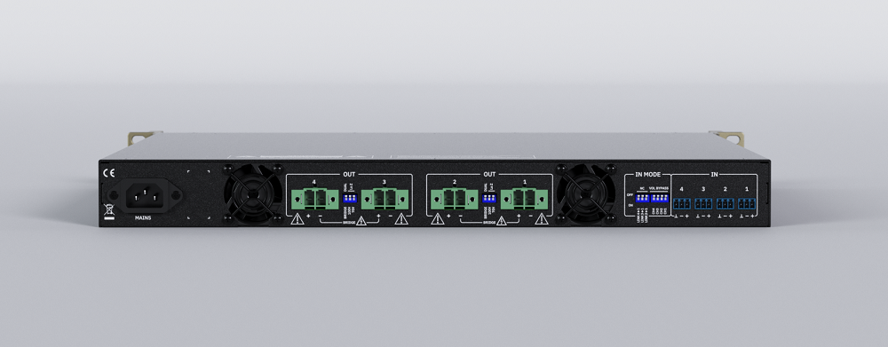 Усилитель оснащён четырьмя аналоговыми линейными входами (разъёмы Euroblock 3-pin) для подключения источников трансляции. Для четырех выходов на акустику (разъёмы Euroblock 2-pin) предусмотрены независимые регуляторы громкости на лицевой панели, где также размещена кнопка активации функции авто-отключения (перехода в дежурный режим, Auto Standby), кнопка включения и светодиодная индикация. Рядом с коннекторами на тыльной части устройства размещены переключатели: у выходов для подключаемого типа акустики, а у входов для блокировки управления и переключатель типа Link для использования во всех каналах одного источника сигнала со входа №1.