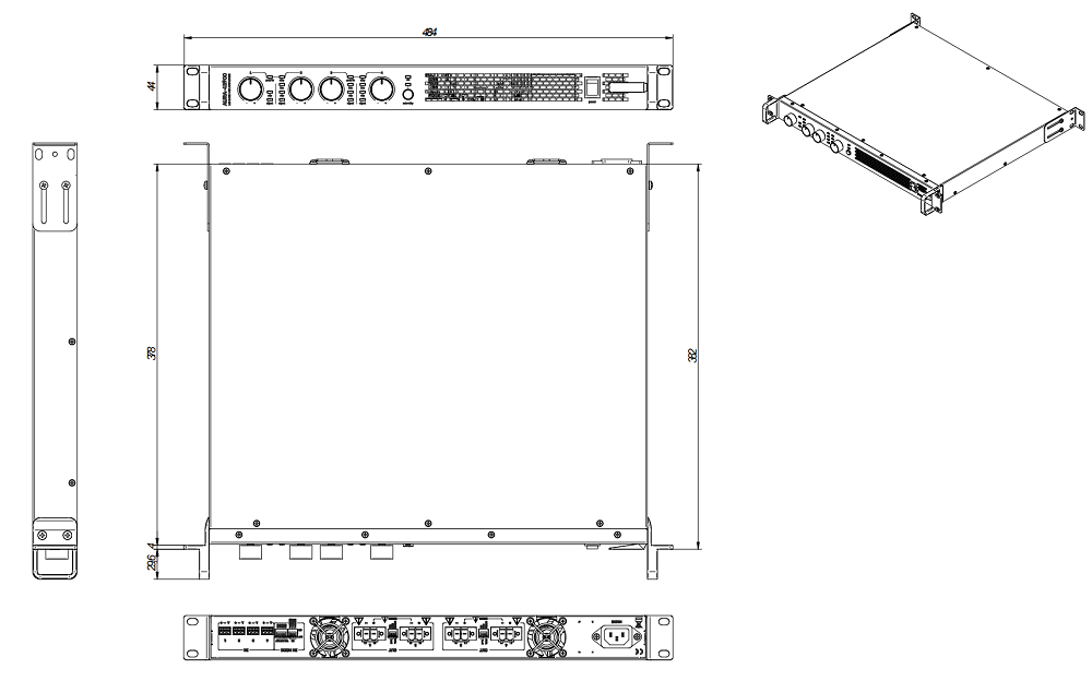 Прибор AURA-4B900 изготовлен в металлическом RACK корпусе высотой 1U, габаритные размеры 484x378x44 мм, вес 7.7 кг. Электропитание организовано от стандартной сети AC 110-240 В.